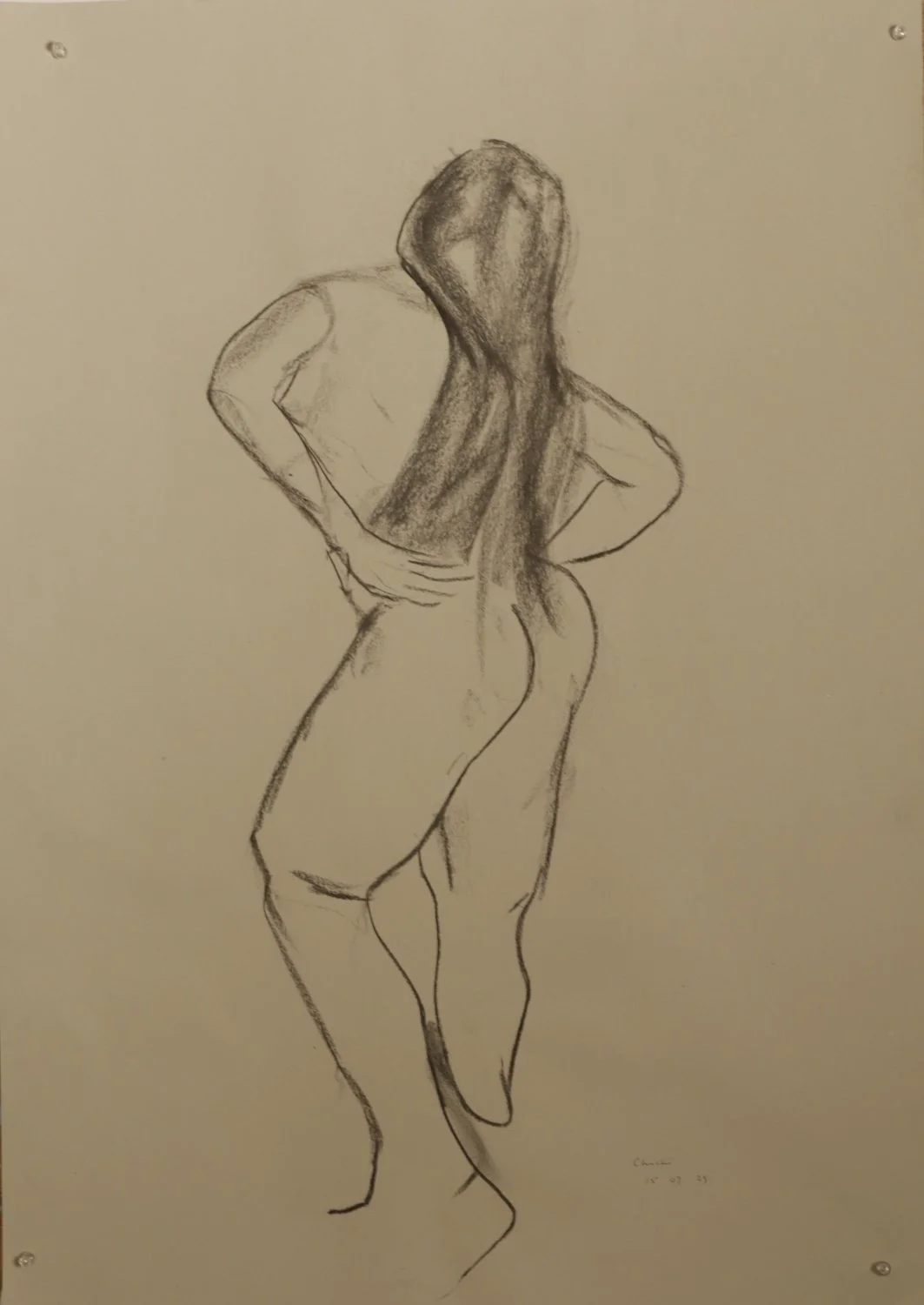 Diane changing pose Charcoal on sugar paper 59 x 84 cms